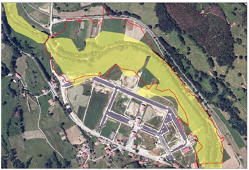 Vista del ámbito del parque empresarial.Influencia de variables en la mancha de inundabilidad T500.Comparación con Sistema Nacional de Cartografía de Zonas Inundables T500.
