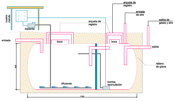 La estación depuradora proyectada contará con tecnología avanzada de oxidación total, que permitirá alcanzar reducciones significativas en sólidos suspendidos y demanda bioquímica de oxígeno (DBO), cumpliendo con los estándares medioambientales de calidad. Para ello, se opta por la instalación de un sistema compacto fabricado en poliéster reforzado con fibra de vidrio, de diámetro de 3,00 m y 176,5 m de longitud total, con tabique en su interior para separar el tanque de aireación con el decantador. La estructura contará con sistema de aporte de oxígeno con soplante de canal lateral, sistema de recirculación de fangos y cuadro eléctrico.